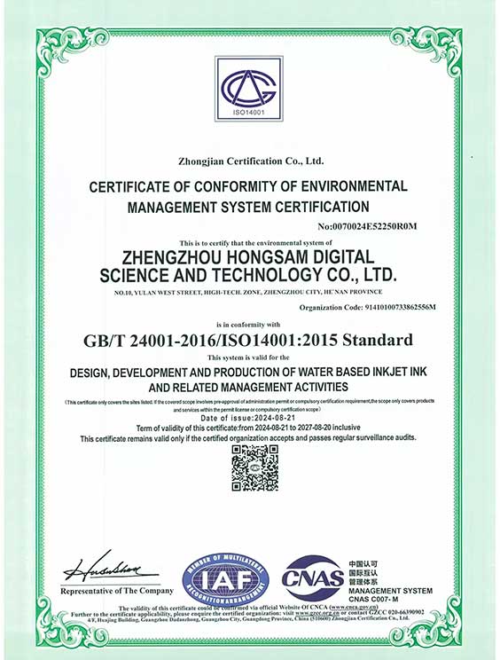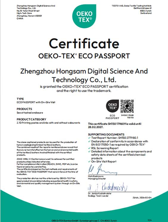 4、鸿美®分散染料墨水获得了瑞士OEKO-TEX机构的ECO-PASSPORT(环保通行证)权威认证证书;