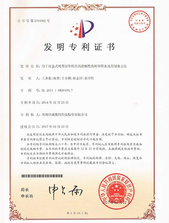 1、鸿盛数码是中国分散染料墨水及生产工艺专利持有人,拥有独立知识产权;