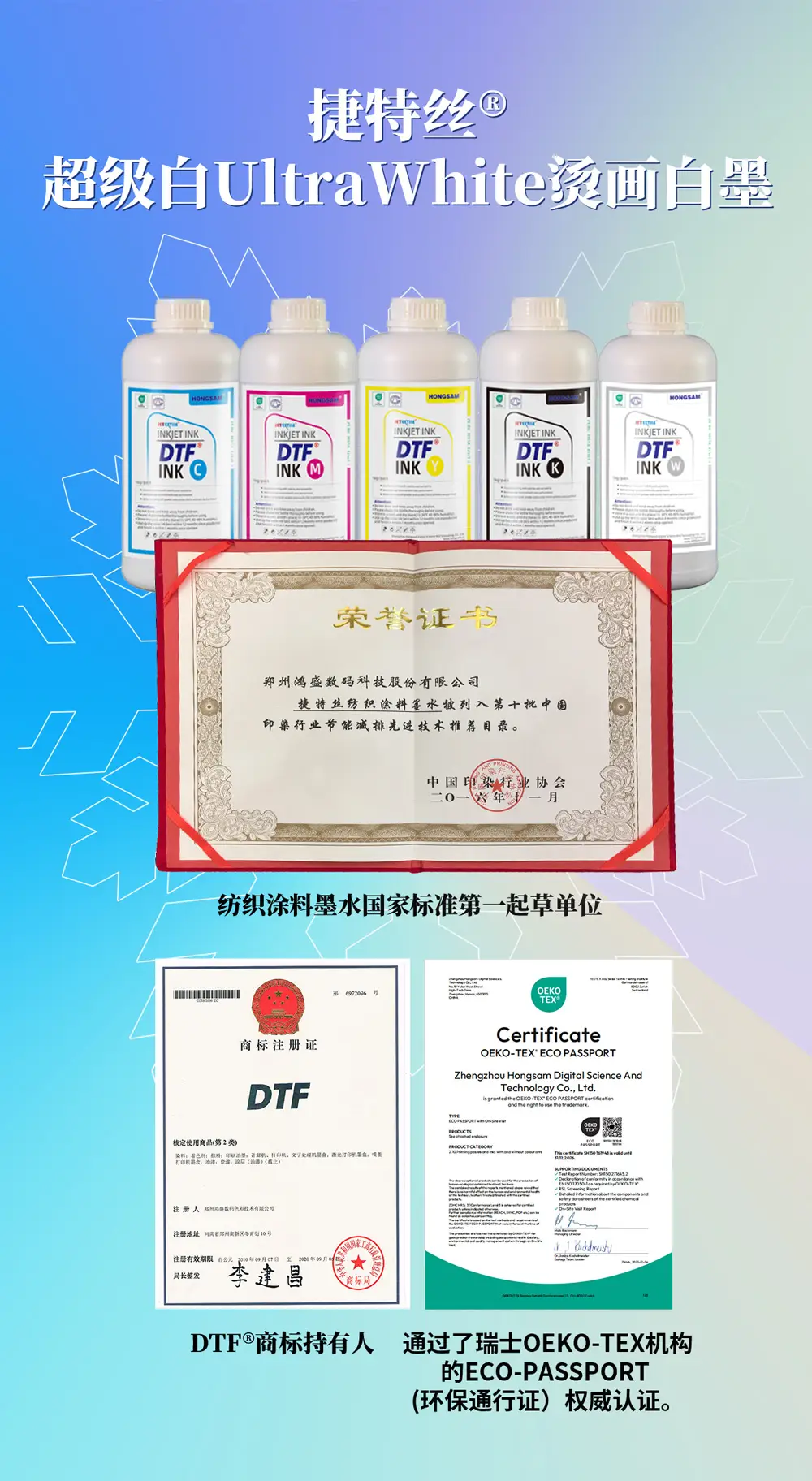 鸿盛数码作为最早一批进入烫画市场的专业墨水供应商,是DTF®商标的持有人,是纺织涂料墨水国家标准第一起草单位。以捷特丝®超级白UltraWhite烫画白墨为核心,产品适合多种爱普生喷头(XP600、TP800、I1600、I3200),白墨打印流畅,兼容市面主流烫画膜和热熔粉,具有较高弹性、白度、水洗牢度和耐刮擦牢度以及缓沉淀特点;产品不含乙二醇等有害溶剂,直击行业痛点,确保接触皮肤安全,儿童服饰和贴身衣物也能放心印,符合绿色环保理念;产品生产过程完全按照5S生产管理,出库产品经过严格的筛选测试。