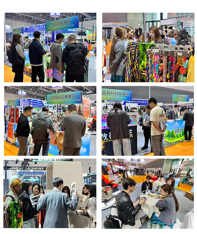 专业观众驻足于样品架前,仔细触摸样品的纹理、观察色彩细节并咨询耐洗色牢度等核心指标。鸿盛数码凭借这些“会说话”的样件,以最直接的方式向业界证明了其墨水在不同介质上的优异表现力。