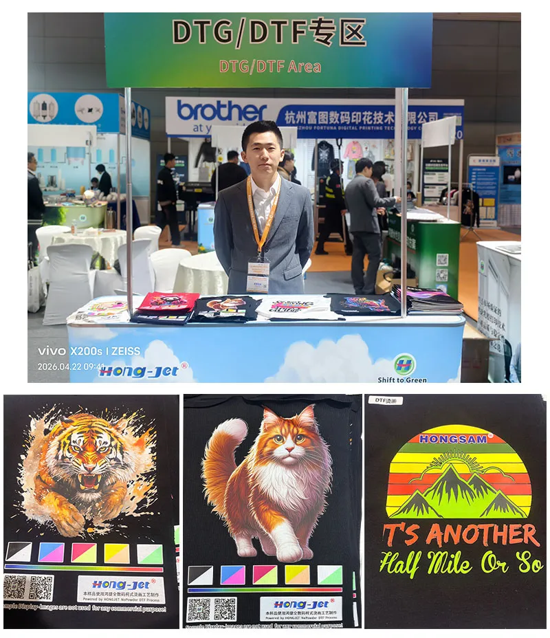鸿盛数码在服装定制行业可提供DTG直喷方案、DTF白墨烫画方案和Hong-Jet®️全数码柯式烫画方案。DTG方案采用捷特丝®纺织涂料彩墨和超级白白墨,支持湿打工艺,成衣透气柔软无硬边。DTF白墨烫画方案配合超级白白墨,实现深色面料精准转印,色彩鲜艳、手感细腻,白墨的超强拉伸性能让印花随面料自由延展,高弹面料上实现550%以上延伸率而不开裂。Hong-Jet®️全数码柯式烫画方案革新传统工艺,省去抖粉环节,流程简单,为用户带来更加透气、环保、高效的解决方案,推动行业向绿色智造方向发展。
