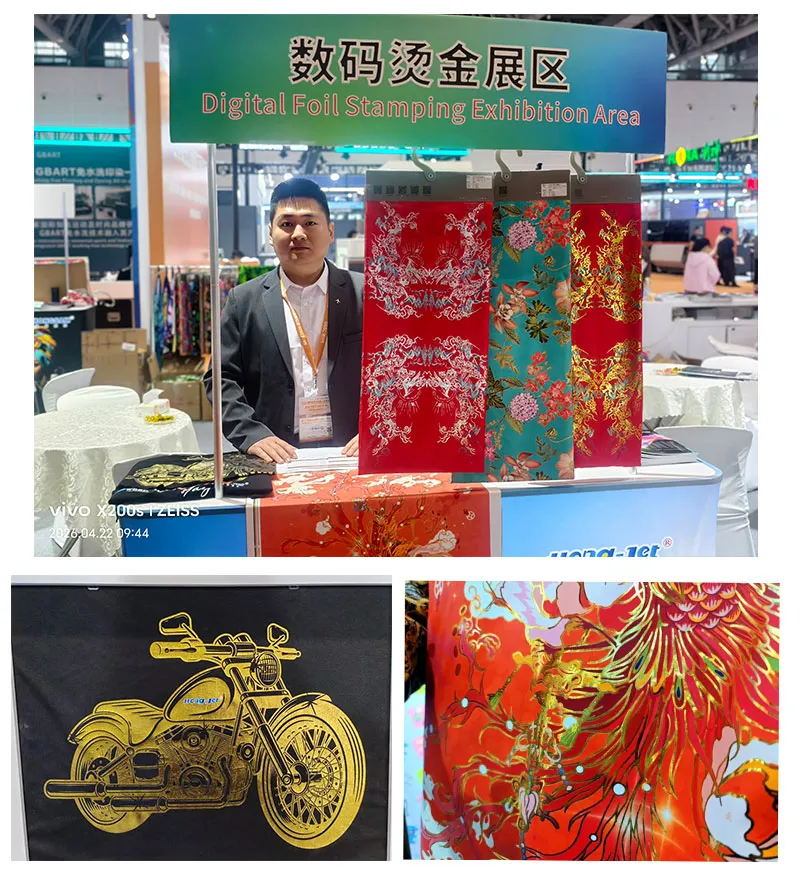 鸿盛数码Hong-Jet®️数码烫金方案涵盖成衣烫金、皮革烫金、涤纶布料烫金三大应用场景。 采用专利数码喷墨烫金工艺,在织物表面精准呈现金属光泽;无需涂层,任何纺织品烫金膜都能轻松应对;图案精细度远超传统工艺,适用于服装和家居装饰。它以环保、高效、低成本的优势,为纺织行业带来了新的发展机遇。