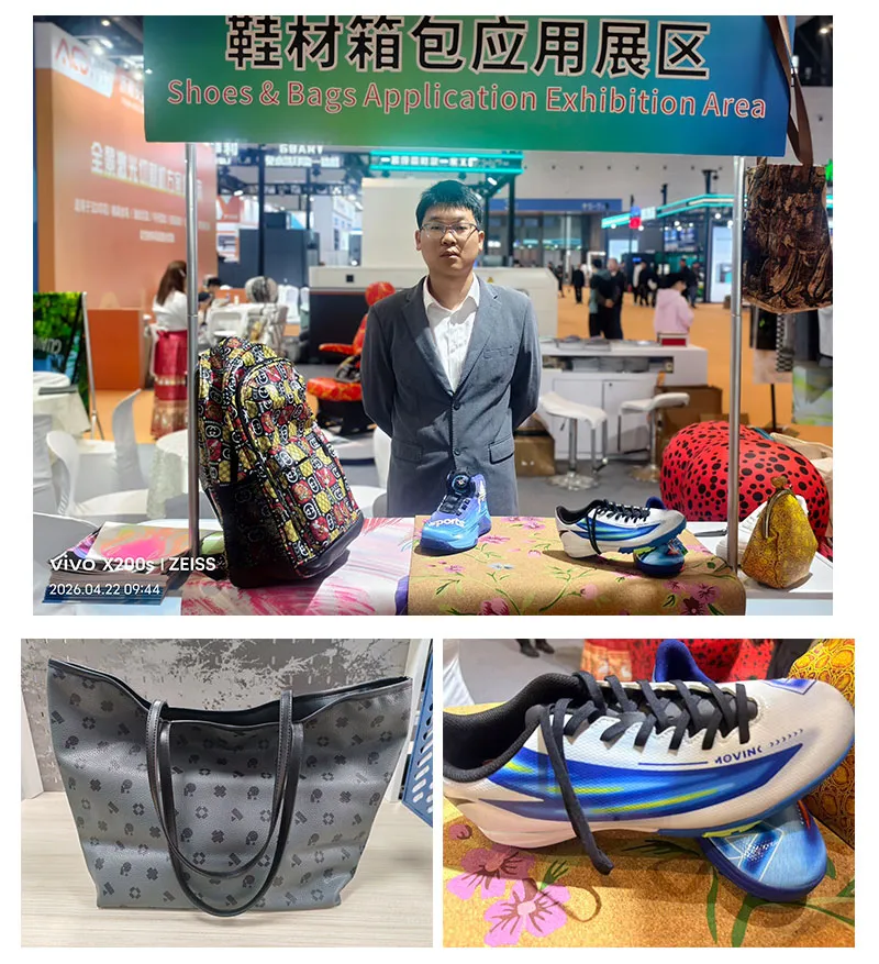 现场展示定制运动鞋、休闲鞋以及高品质皮革背包,有非常细腻触感与耐磨表现 。鸿盛数码Hong-Jet®️乳胶打印方案采用水性环保乳胶墨水,具备优异的柔韧性和附着力,在真皮、PU革、PVC革、超纤革等材质上呈现细腻色彩层次,满足鞋材箱包对耐磨耐折的严苛要求。