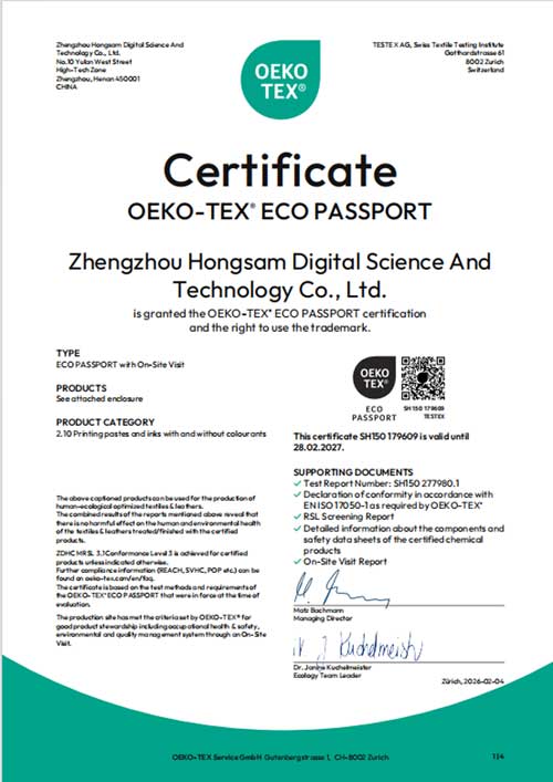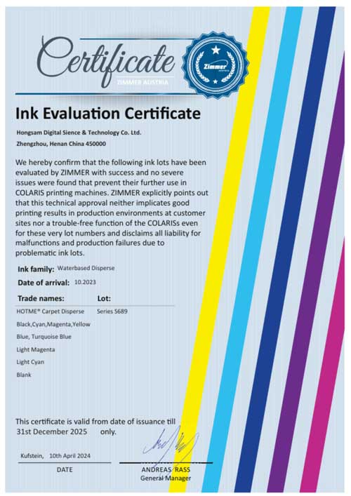 鸿盛分散染料墨水产品通过了瑞士OEKO-TEX机构的ECO-PASSPORT(环保通行证)权威认证。并且在2013年,成功入选《中国印染行业第七批节能减排先进技术推荐目录》。鸿盛数码的高品质地毯分散墨水,通过了ZIMMER公司的严格测试,获得了ZIMMER公司认证。
