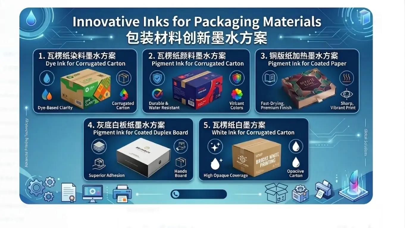 一、瓦楞纸染料墨水方案:色彩鲜艳,成本优化 专为瓦楞纸板数码印刷量身定制,采用高纯度水溶性染料配合自主研发渗透控制技术,实现墨水快速渗透与均匀着色。 核心优势:高渗透性配方解决边缘扩散问题;色彩鲜艳透亮,适合食品、礼品包装;成本较颜料墨水降低30%-50%;配合烘干设备实现即印即干。适用于电商物流箱、食品饮料包装、工业产品外包装等场景,印刷速度可达30-150米/分钟。